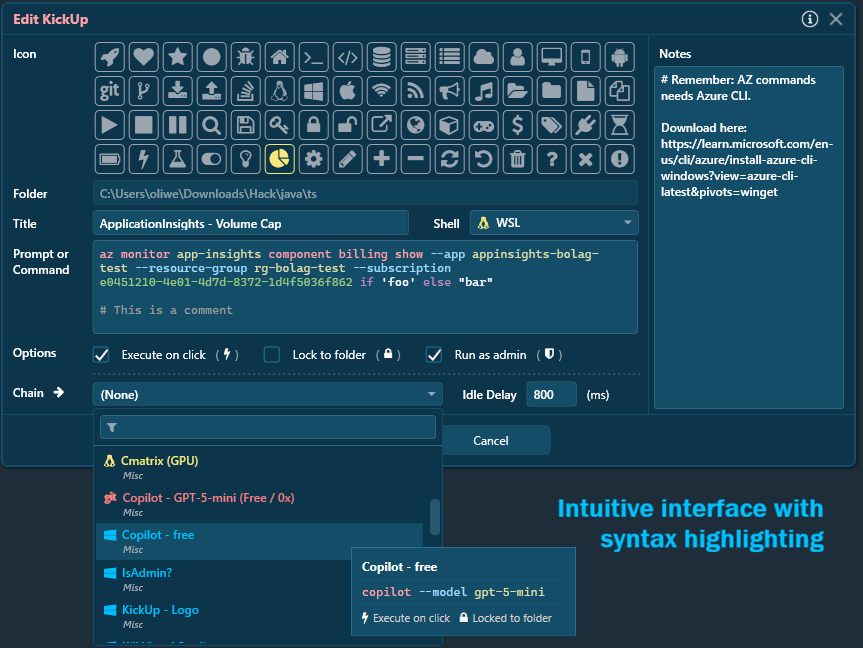 Create KickUp buttons of your complex commands and move them easily between your saved folders using drag-and-drop.